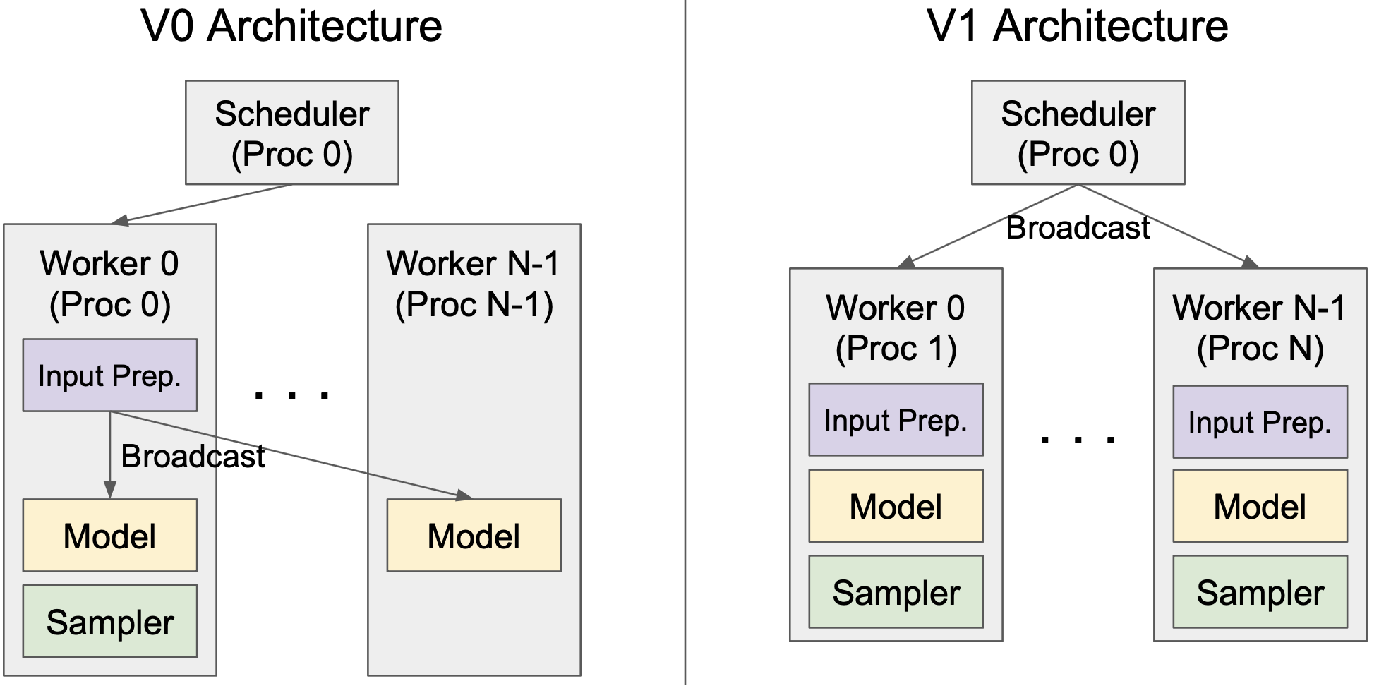 vLLM V1 introduces a clean and efficient architecture for tensor-parallel inference, effectively addressing the limitations of V0. In V0, the scheduler and Worker 0 are colocated within the same process to reduce the inter-process communication overhead when broadcasting input data to workers. However, this design introduces an asymmetric architecture, increasing complexity. V1 overcomes this by caching request states on the worker side and transmitting only incremental updates (diffs) at each step. This optimization minimizes inter-process communication, allowing the scheduler and Worker 0 to operate in separate processes, resulting in a clean, symmetric architecture. Moreover, V1 abstracts away most distributed logic, enabling workers to operate the same way for both single-GPU and multi-GPU setups.