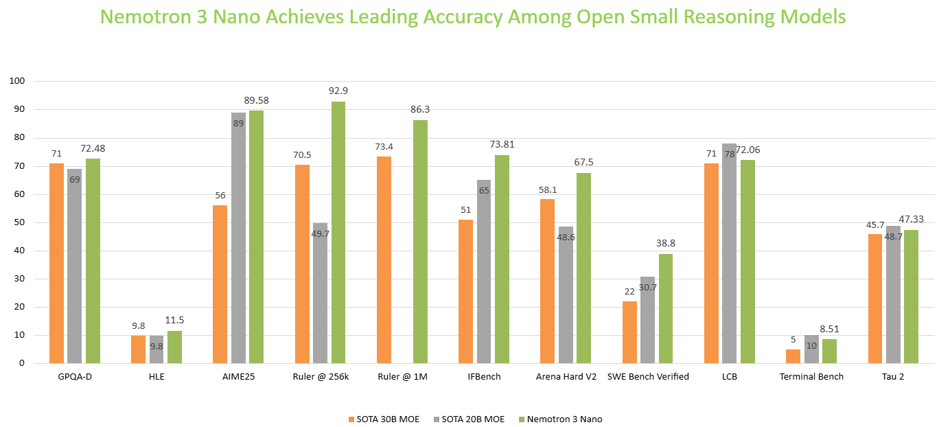 Nemotron 3 Nano excels in coding, reasoning, and agentic tasks, and leads on benchmarks such as SWE Bench Verified, GPQA Diamond, AIME 2025, Arena Hard v2, and IFBench.